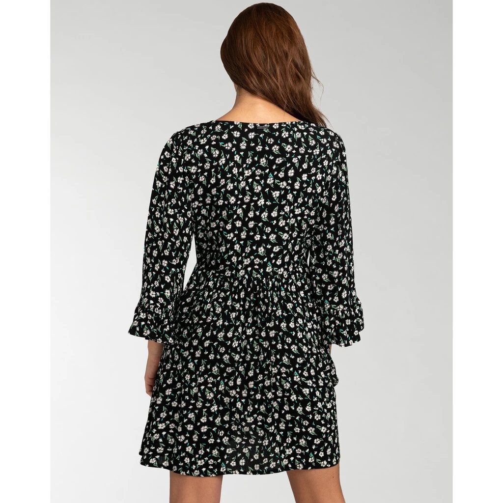 Babydoll-Kleid für Frauen. Die Eigenschaften dieses Produkts sind: Crinkle Viskose-Stoff, Eng anliegendes Oberteil, fließender Rock, Tiefer V-Ausschnitt, 3/4-lange Flatterärmel mit Rüschen an der Öffnung, 84 cm lang, Logo: Metallplakette und Andere Features: Rüschen-Detail am Stufen-Rock.After Time – Babydoll-Kleid für Frauen