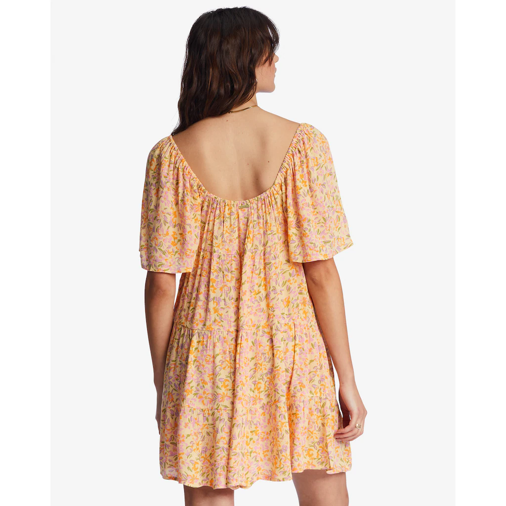 Babydoll-Kleid für Frauen. Die Eigenschaften dieses Produkts sind: Crinkle Viskose-Stoff, Luftiger Fit, V-Ausschnitt, Flatterärmel, Logo: Metallplakette und Weitere Merkmale: Gestufte Rüschen am Rock.Take A Chance – Babydoll-Kleid für Frauen
