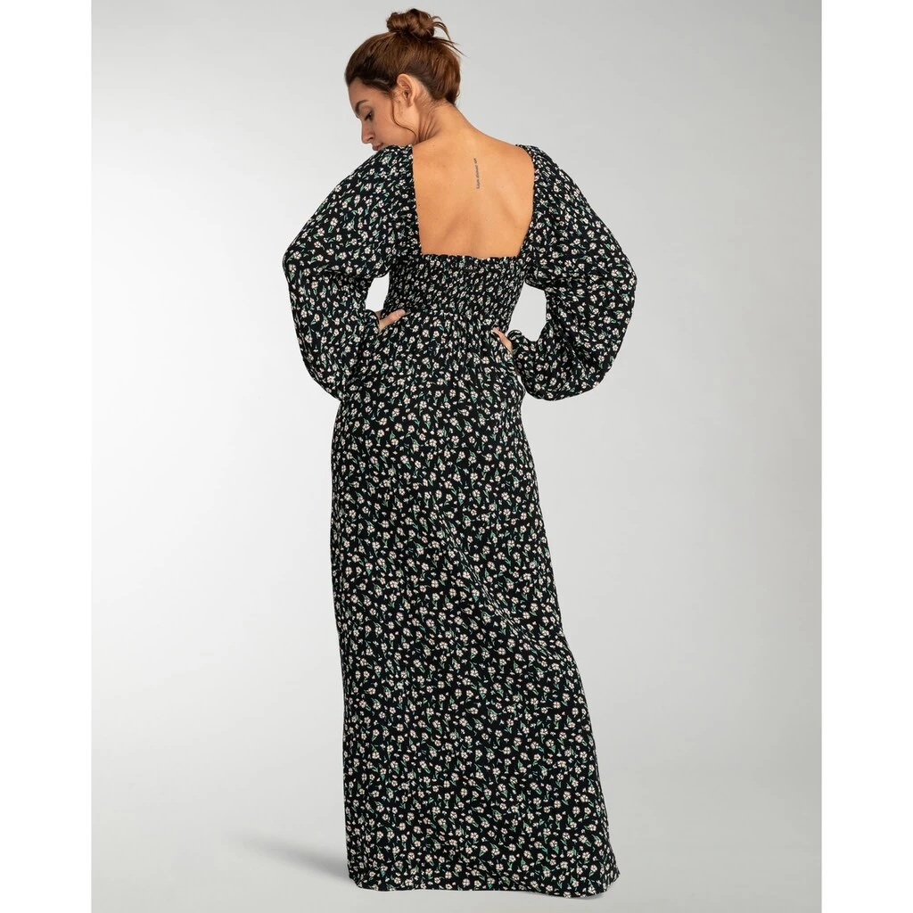 Maxikleid für Frauen. Die Eigenschaften dieses Produkts sind: Crinkle Viskose-Stoff, Passgenaues Mieder, lockerer Rock, Kragen/Ausschnitt: Quadratischer Ausschnitt mit gesmoktem Einsatz auf der Brust, Blouson-Ärmel, 139 cm Länge und Logo: Metallplakette.Love Island – Maxikleid für Frauen