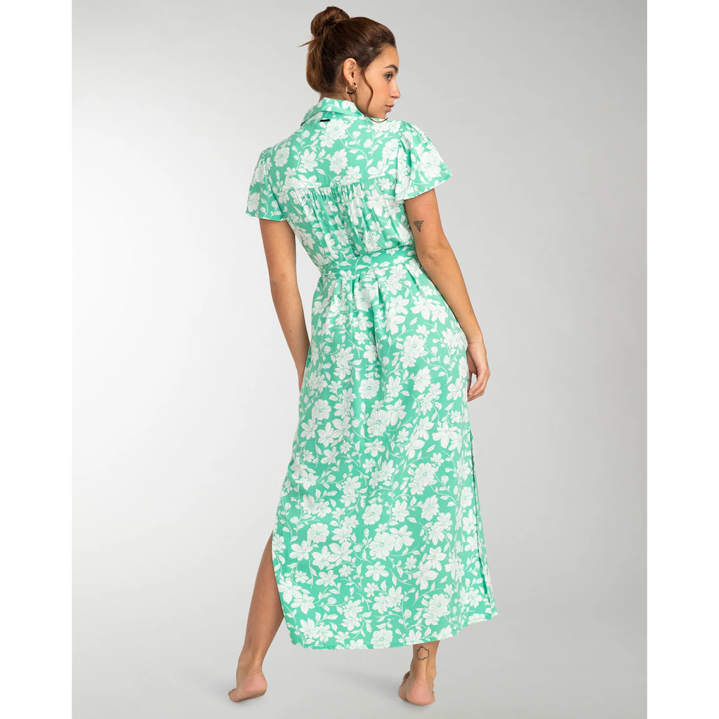 Maxi-Hemdkleid für Frauen. Die Eigenschaften dieses Produkts sind: Crinkle Viskose-Stoff, Relaxed Fit, Kragen/Ausschnitt: Hemd-Kragen, kurzärmlig, 130 cm lang, Logo: Metallplakette, Weitere Merkmale: Abnehmbarer Stoffgürtel und Knopfverschluss auf der Vorderseite.Sweet Day – Maxi-Hemdkleid für Frauen